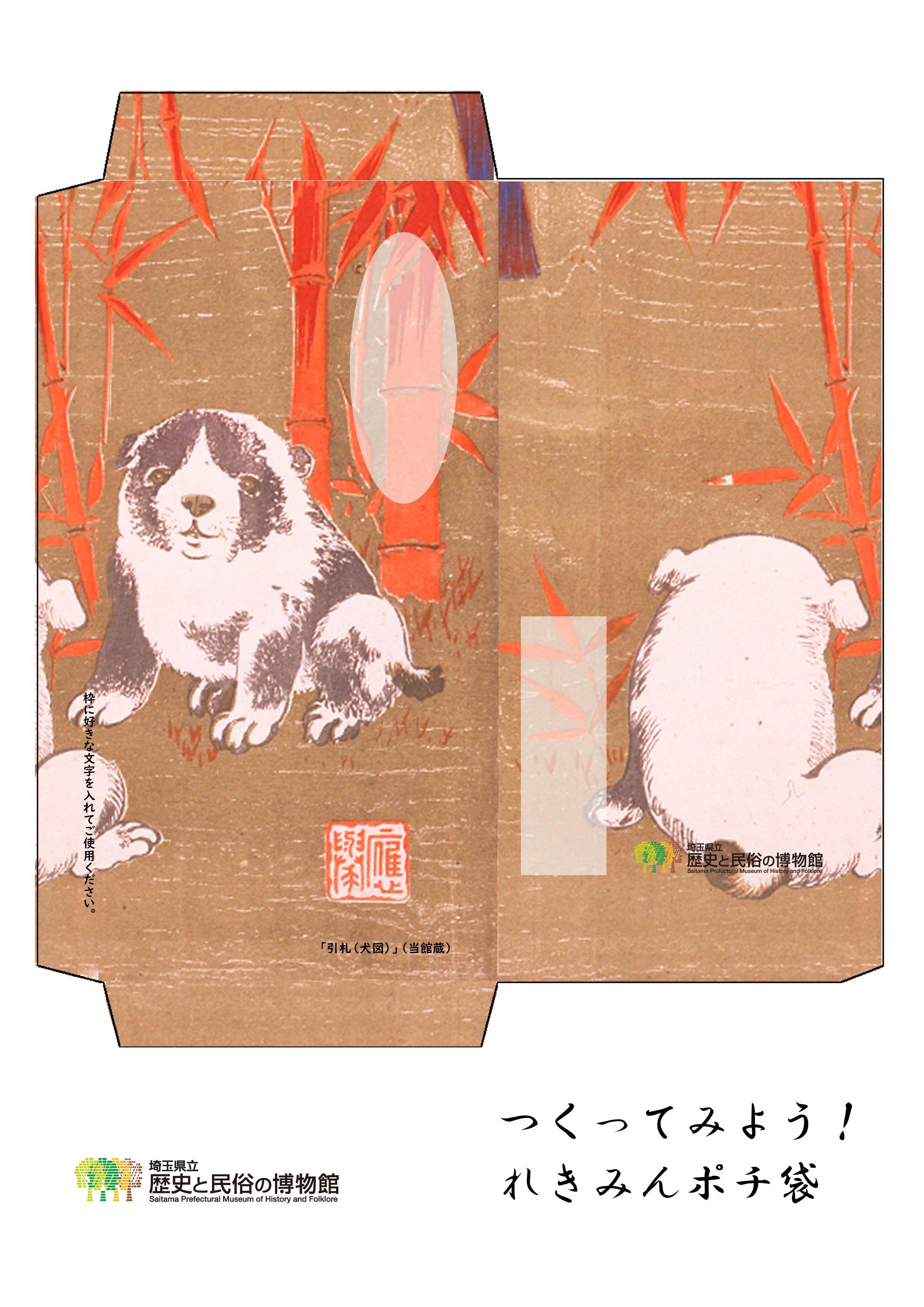 | 当館収蔵の「引札(犬図)」(製作者 児玉新町 山二平田屋平次郎)の柄をポチ袋にしました。 「引札(ひきふだ)」とは現在の広告チラシにあたるもので、この引札は江戸時代の絵師・円山応挙(まるやまおうきょ)の描いた子犬を参照しているようです。 |